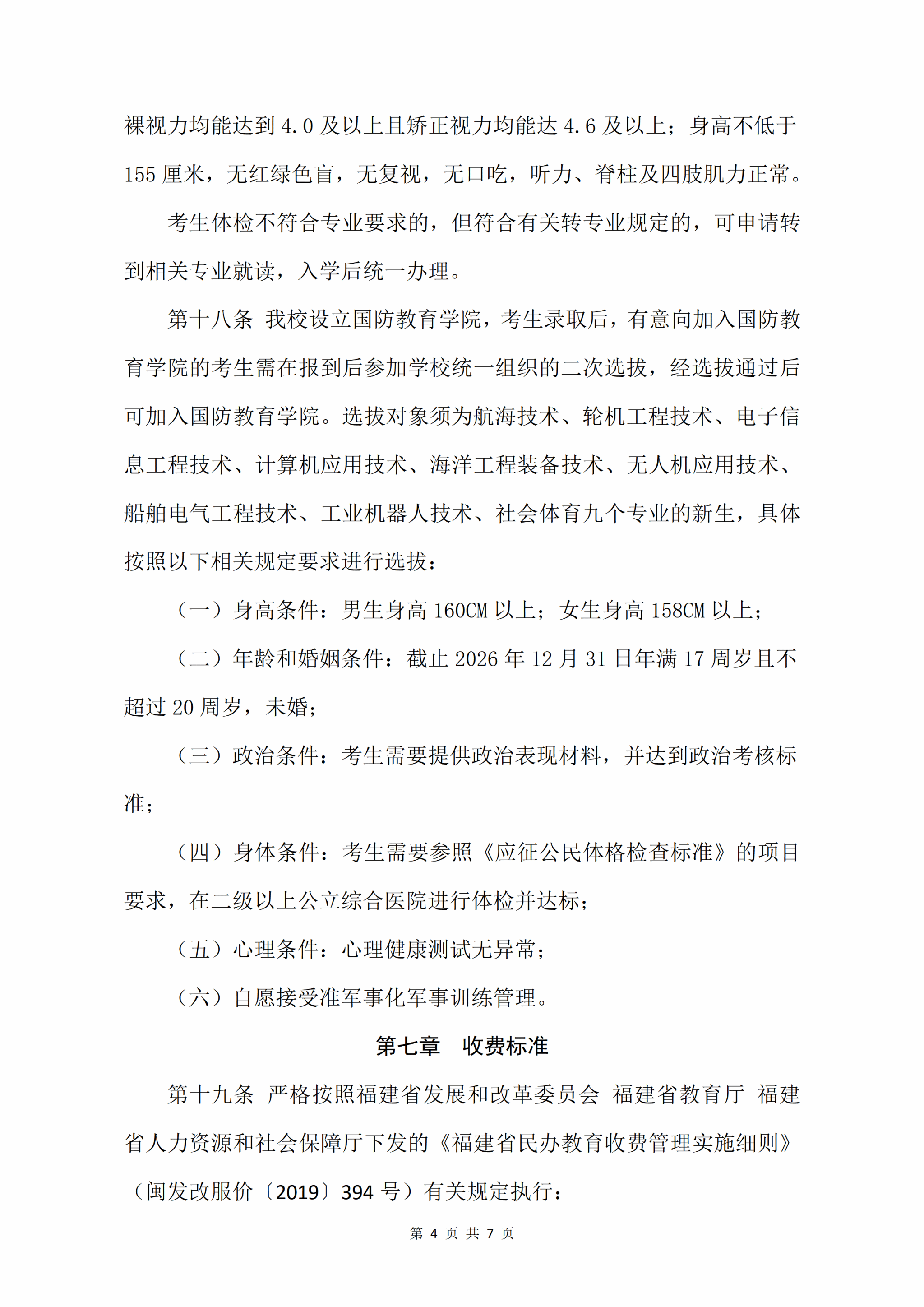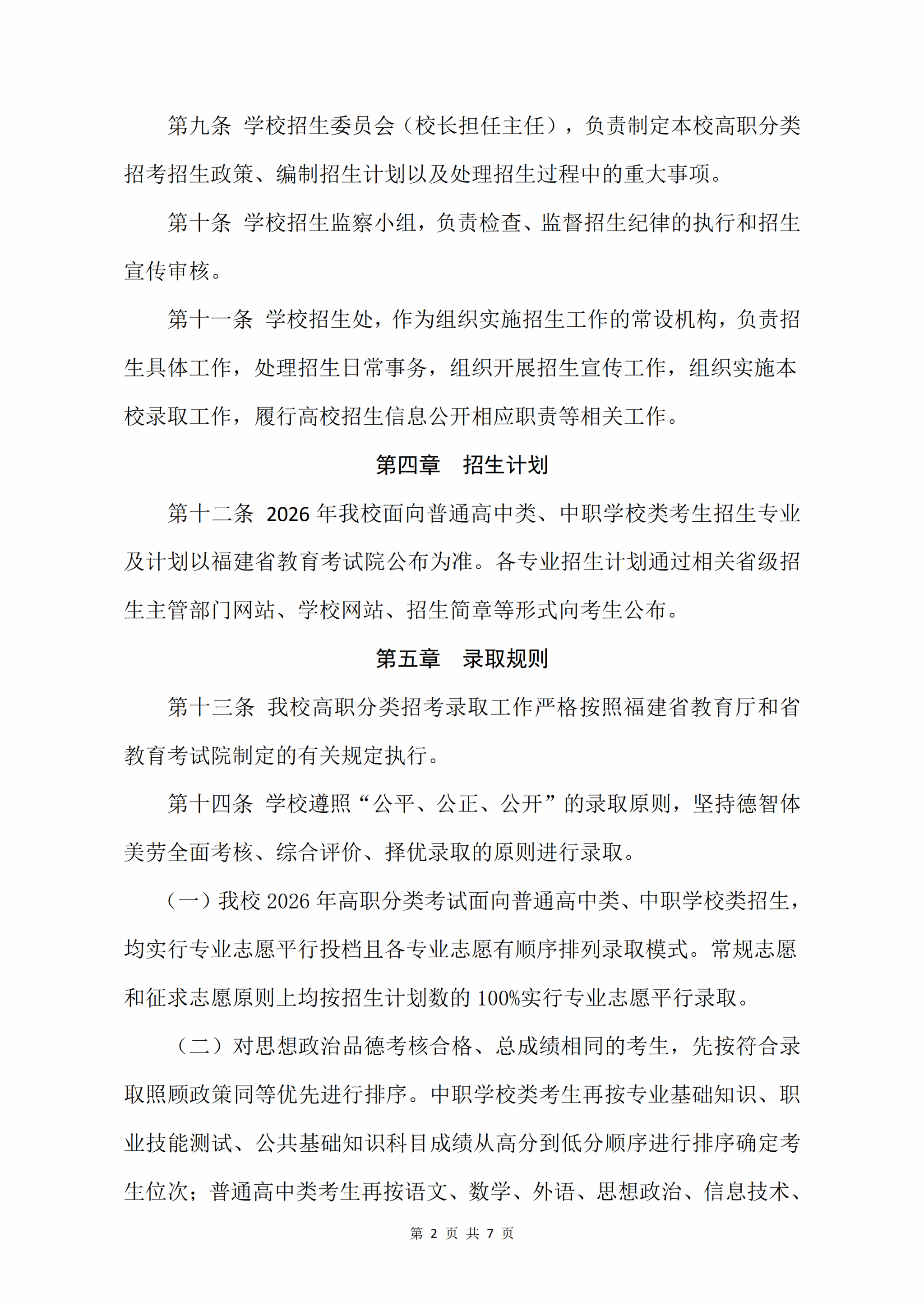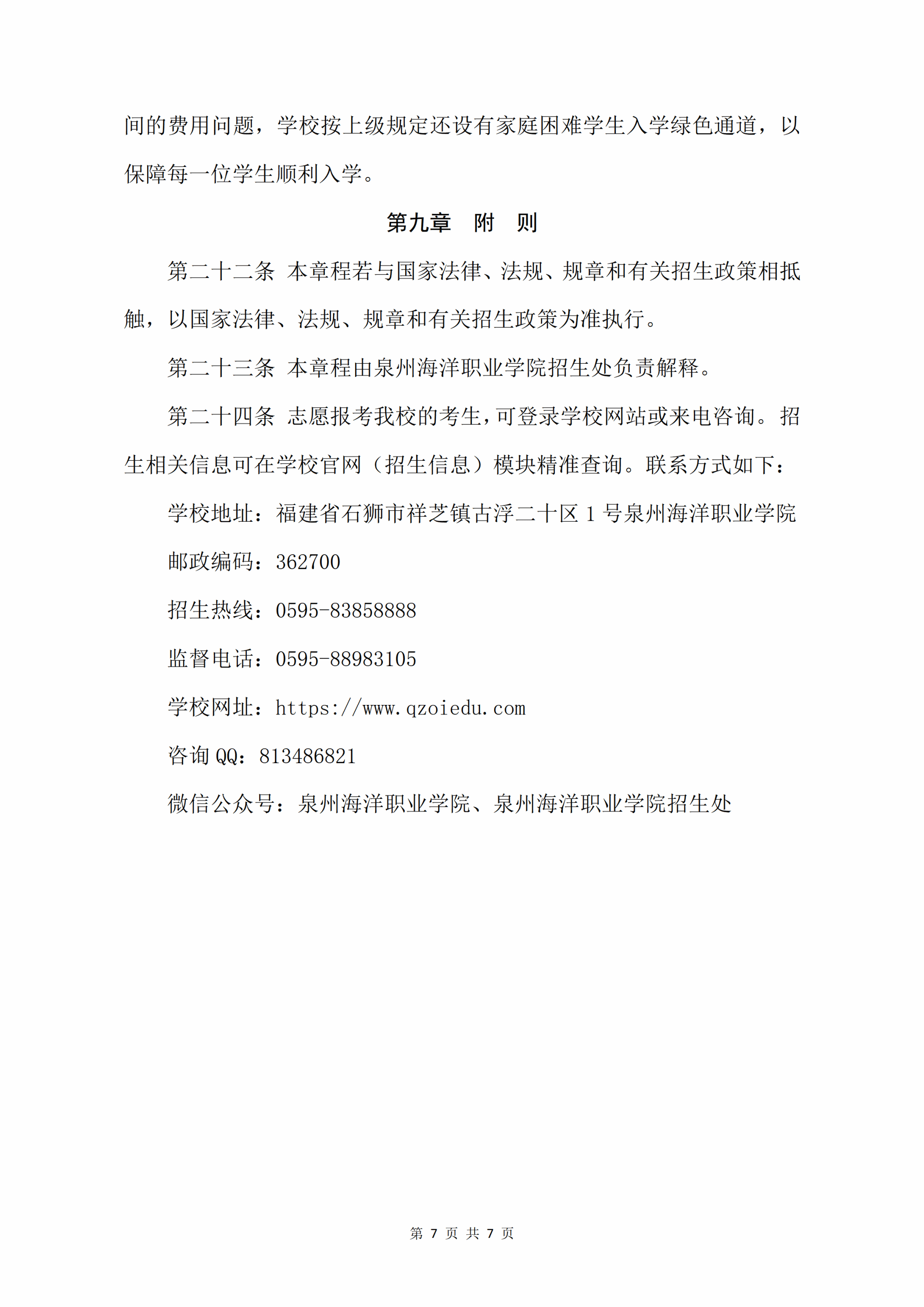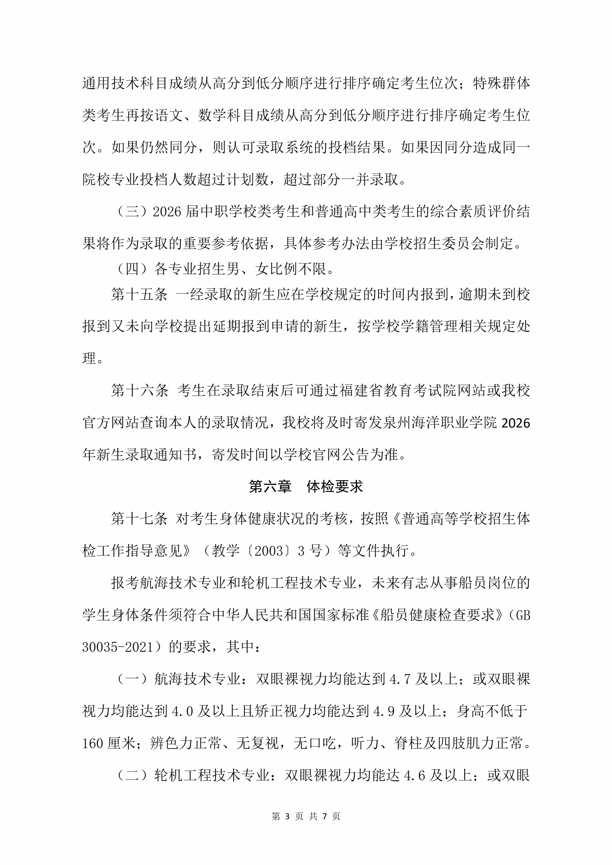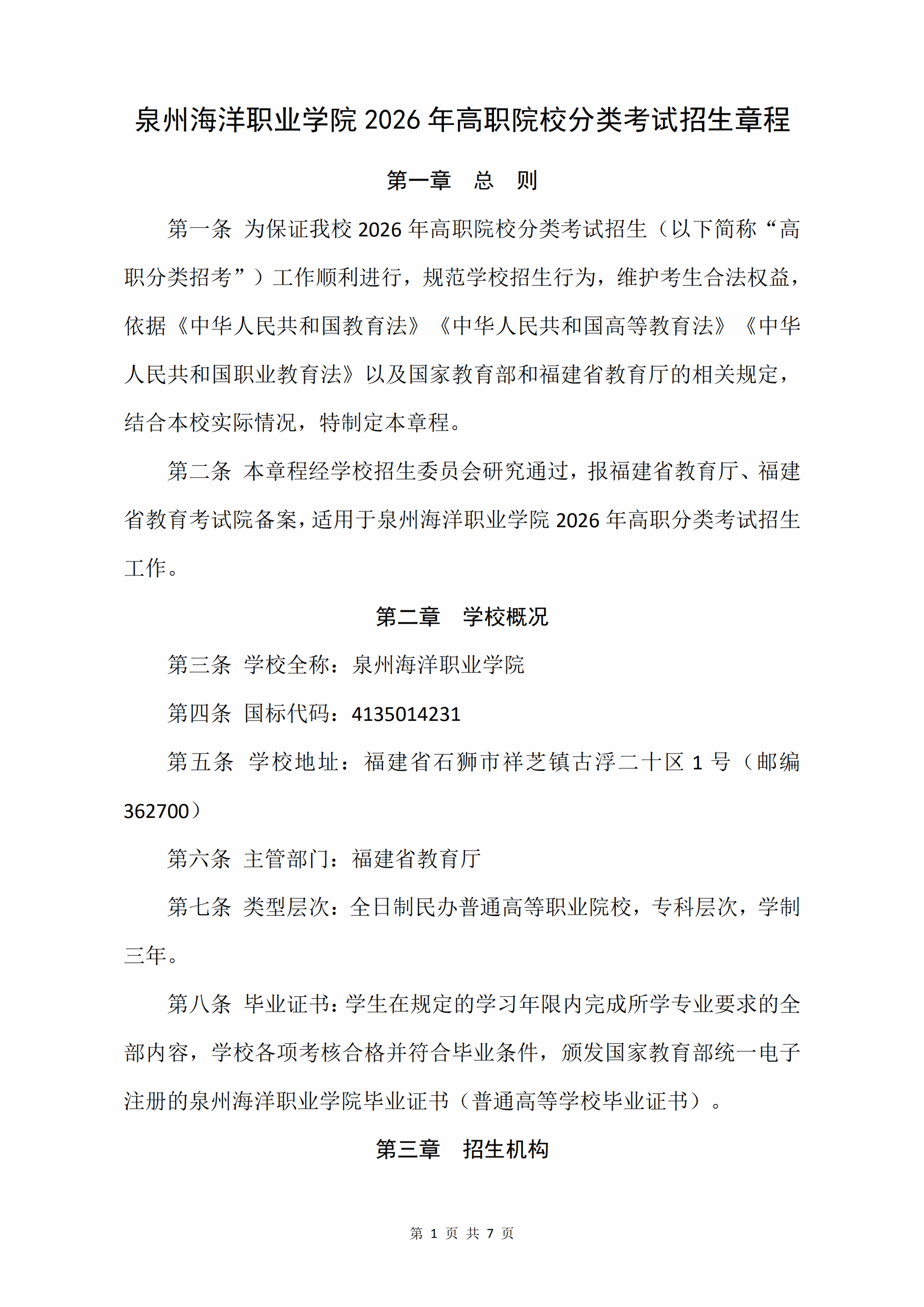 泉州海洋职业学院2026年高职院校分类考试招生章程