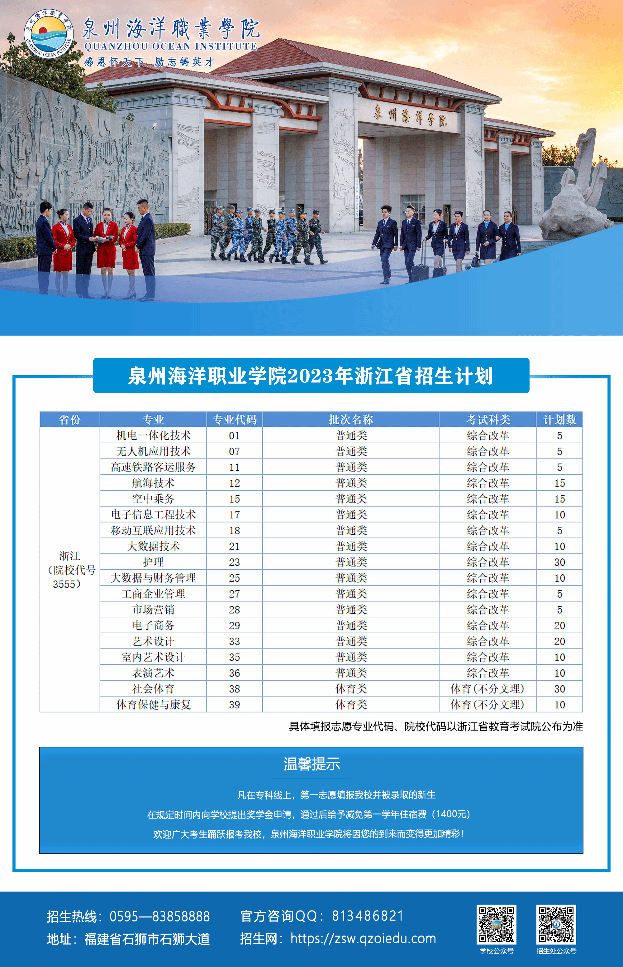 泉州海洋职业学院2023年浙江省招生计划