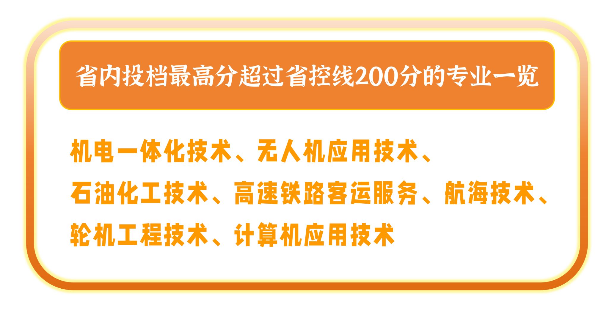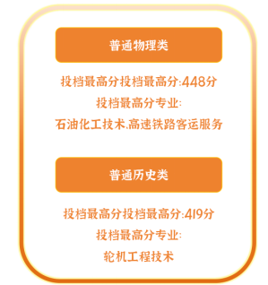 从考生填报的专业志愿情况来看,我校优质专业继续受到省内外的考生追捧。我校机电一体化技术、石油化工技术、计算机应用技术、高速铁路客运服务等多个专业受到省内考生追捧。省内招生的39个专业中,其中,有18个专业投档最低分超过省控线150分;物理类投档最高分高于省控线200分的专业有7个,高速铁路客运服务、石油化工技术专业最高投档分为448分。