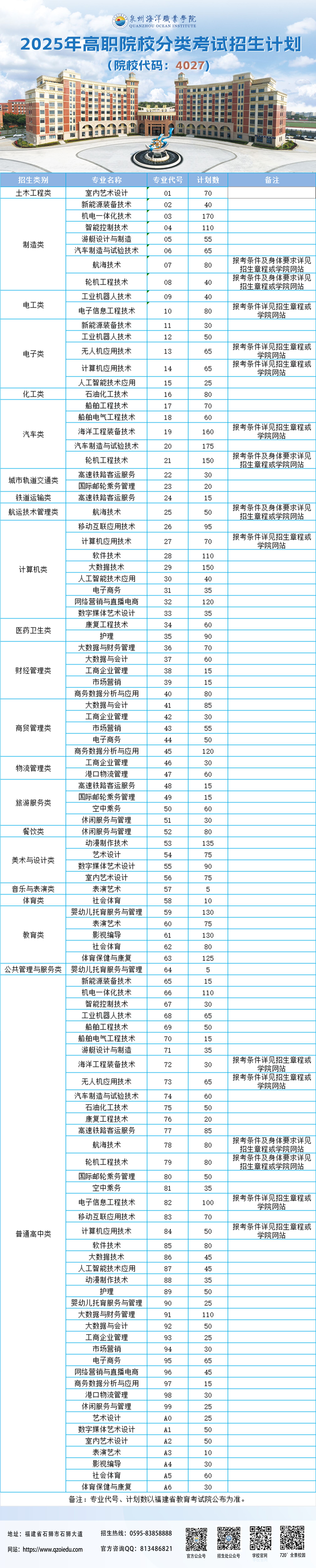 泉州海洋职业学院2025年福建省高职院校分类考试招生计划