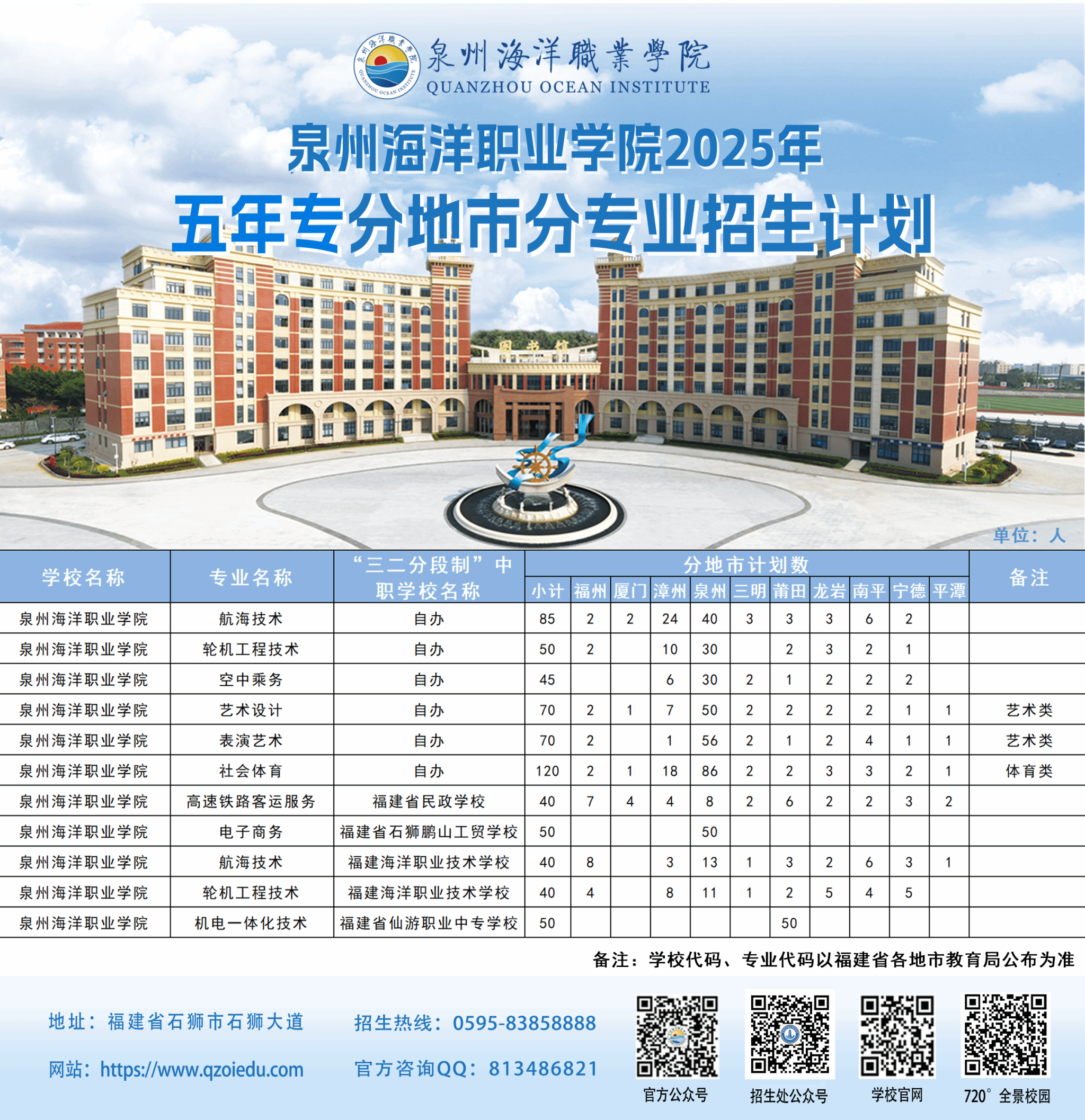 泉州海洋职业学院2025年五年专分地市招生计划