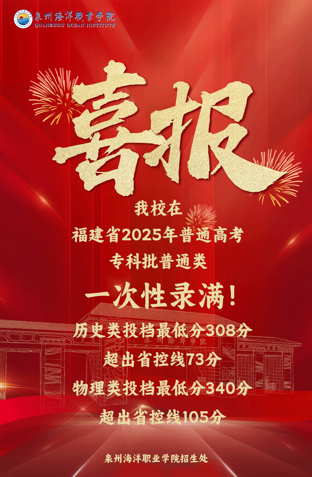 今年我校面向福建省投放的专科批次普通类、体育类计划一次性满档。其中普通类物理科目组与体育类专业连续三年保持满档记录;普通类历史科目组计划完成率100%,较去年同比提升显著,报考热度创历史新高。