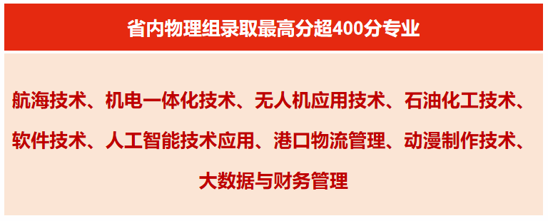 从报考情况看,我校一批优质专业成为省内外考生的“热门选择”,呈现“多类别专业全面均衡发展”的态势。省内招生专业中,物理类八成专业录取最低分超过省控线120分。航海技术、机电一体化技术、无人机应用技术、石油化工技术、软件技术、港口物流管理、动漫制作技术、大数据与财务管理等专业报考热度居高不下。