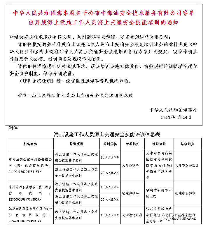 疫情挡不住喜讯的到来!3月24日,中华人民共和国海事局颁发《关于公布中海油安全技术服务有限公司等单位开展海上设施工作人员海上交通安全技能培训的通知》,我校成为全国首批开展此项培训业务的单位。