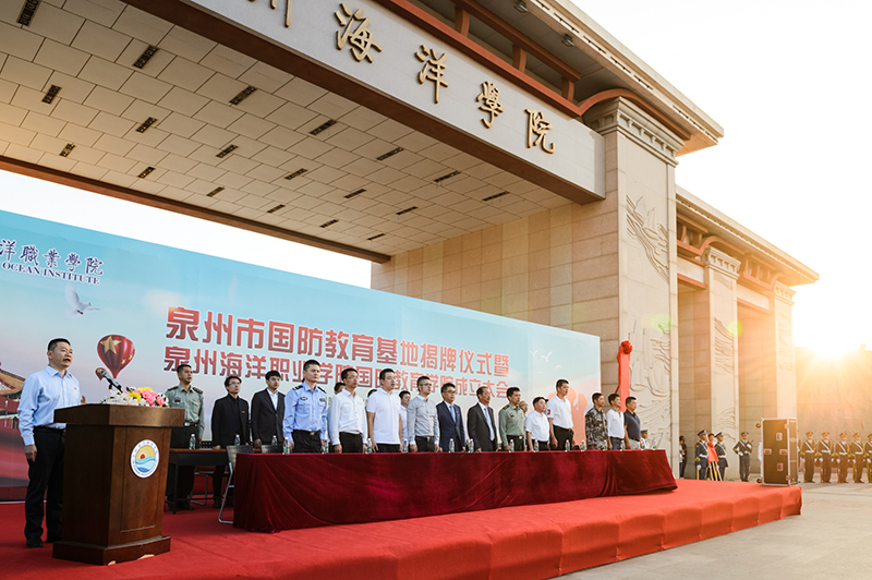 仪式上,泉州军分区政治部沈文罡主任宣读《批复泉州海洋职业学院为泉州市国防教育基地》文件。蔡天真董事长和沈文罡主任共同为泉州市国防教育基地揭牌。