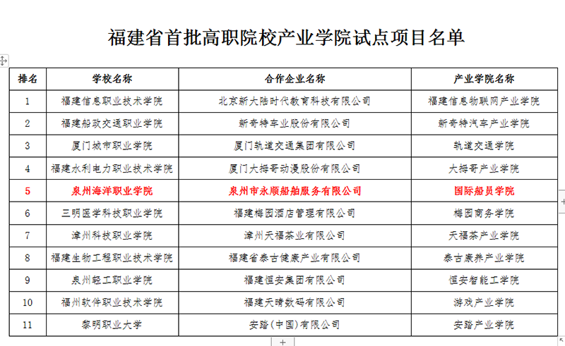 近日,福建省教育厅下发《福建省教育厅关于公布福建省首批高职院校产业学院试点项目的通知》,泉州海洋职业学院与泉州市永顺船舶服务有限公司合作共建的国际船员学院正式获批福建省首批高职院校产业学院试点项目。