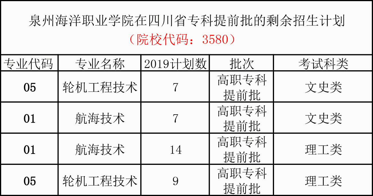 泉州海洋学院2019年在四川省专科提前批的录取已结束,各位考生可登陆网站:http://www.qzoiedu.com/Dzs/lqcx输入姓名、身份证号查询录取结果!未被录取的考生可在8月8日19:00至8月9日12:00填报征求志愿。考生凭准考证号和密码登录“四川省2019年普通高校招生志愿填报系统(网址:http://zj.scceea.cn)进行网上补报志愿。超过规定时间后,补报志愿系统将自动关闭。