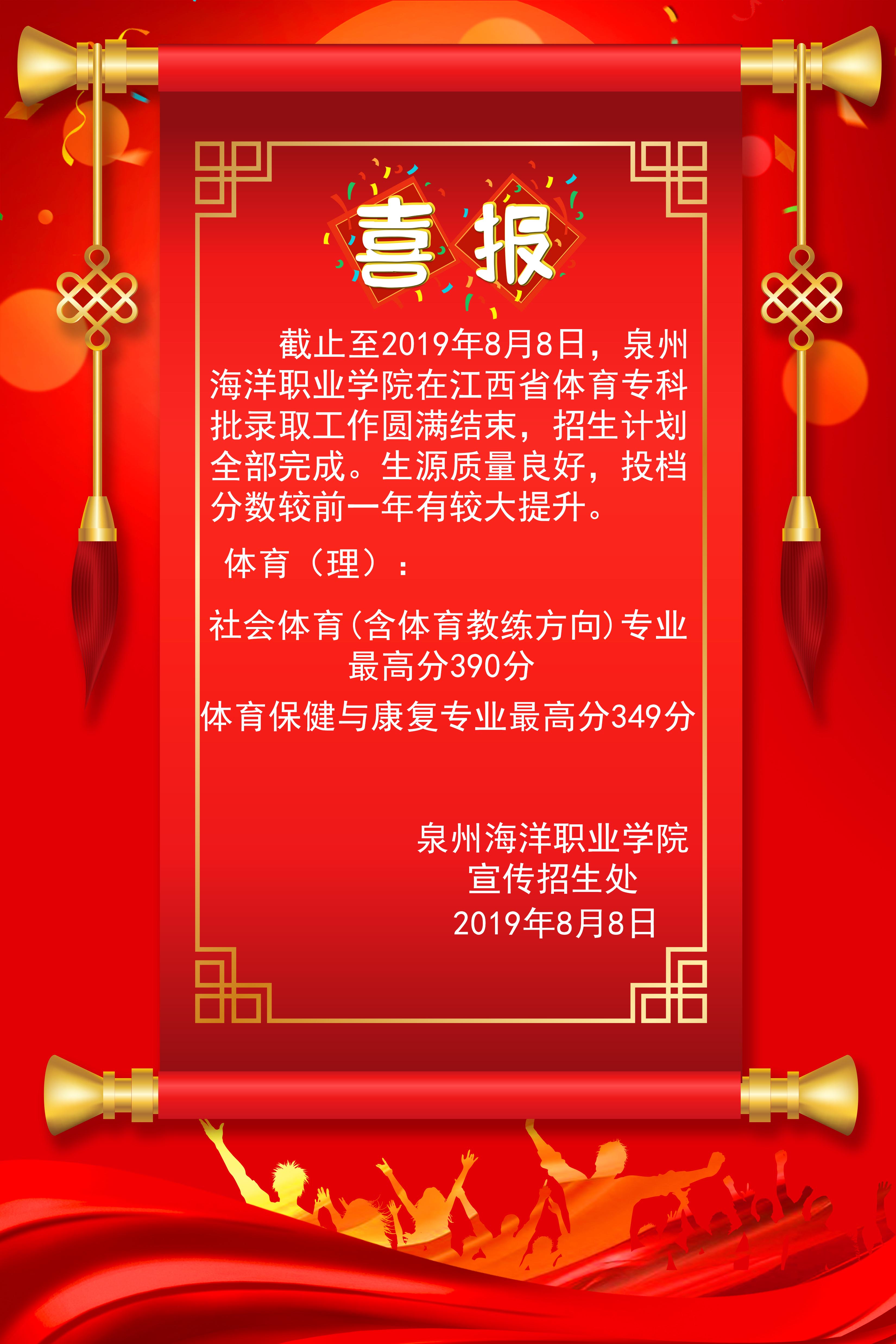 泉州海洋职业学院2019年江西省体育专科批已录取结束,各位考生可登陆网站:http://www.qzoiedu.com/Dzs/lqcx输入姓名、身份证号查询录取结果!