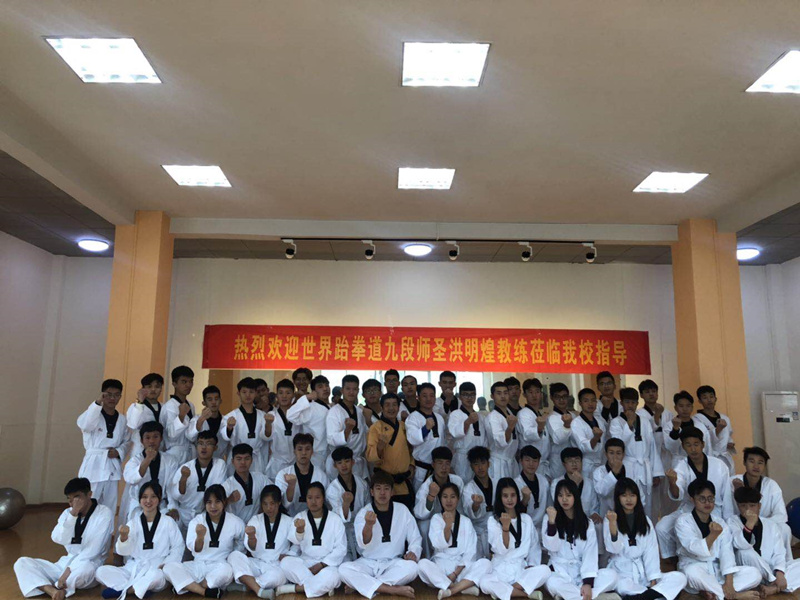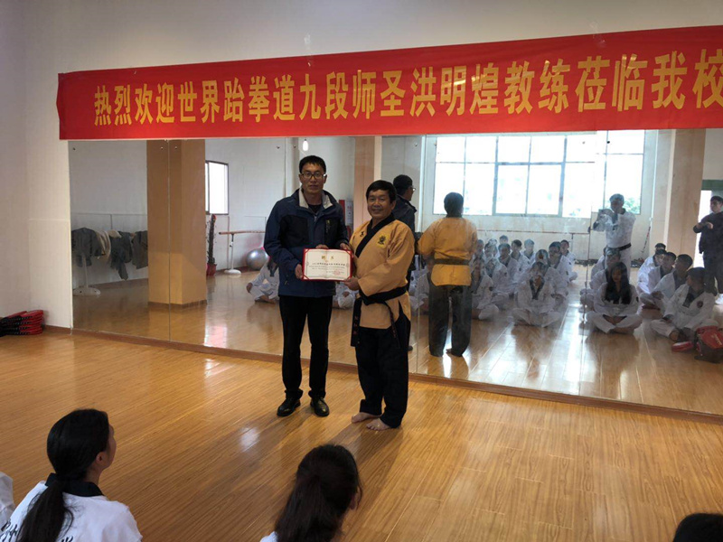 新闻中心讯(党政办报道)2019年3月25日,应艺术体育系邀请,世界跆拳道九段师圣洪明煌教练(中国台湾)莅临我校现场指导教学,为社会体育专业的同学们上了一节别开生面的跆拳道课程。我院艺术体育系孙玉坤副主任为洪明煌先生现场颁发艺术体育系跆拳道客座教练聘书。