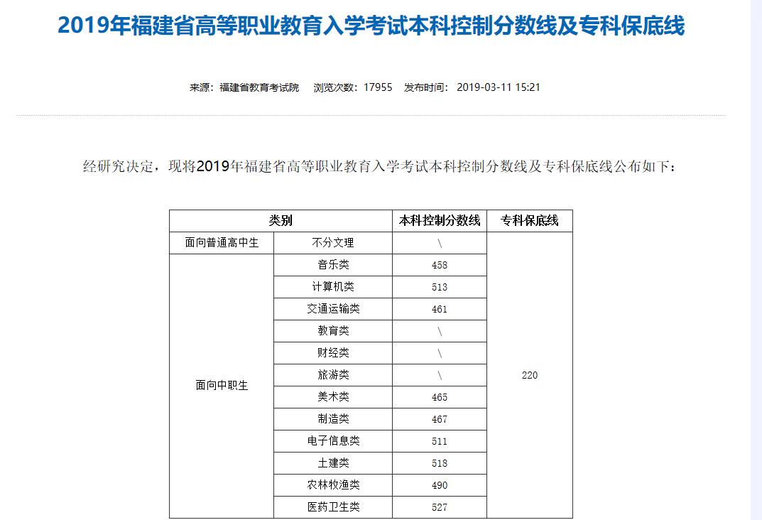 2019年福建省高等职业教育入学考试分数线
