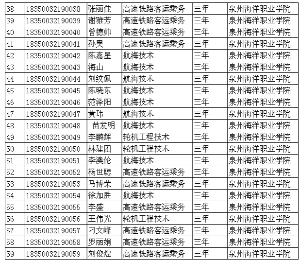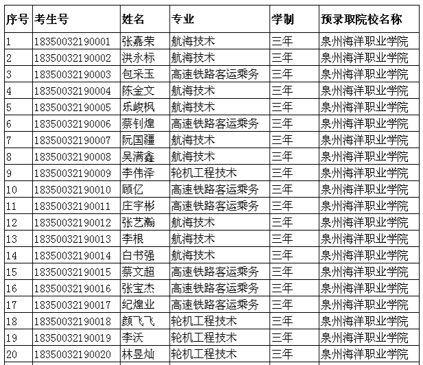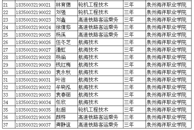 根据闽教考〔2018〕23号文的相关规定,我院 “二元制招考”现已完成报名、资格确认和考试等各阶段的招生录取工作。经我院招生委员会审核,确定了2018年我院参加“二元制”考试考生达到预录取分数线的名单。现按照福建省教育厅要求,将泉州海洋职业学院2018年参加“二元制”考试考生达到预录取分数线名单公示如下: