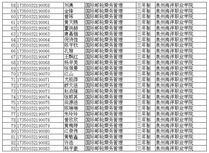 根据闽教考〔2017〕15号文的相关规定,我院 “二元制招考”现已完成报名、资格确认和考试等各阶段的招生录取工作。经我院招生委员会审核,确定了2017年我院国际邮轮乘务管理专业参加“二元制”考试考生达到预录取分数线的名单。现按照福建省教育厅要求,将泉州海洋职业学院2017年参加“二元制”考试考生达到预录取分数线名单公示如下: